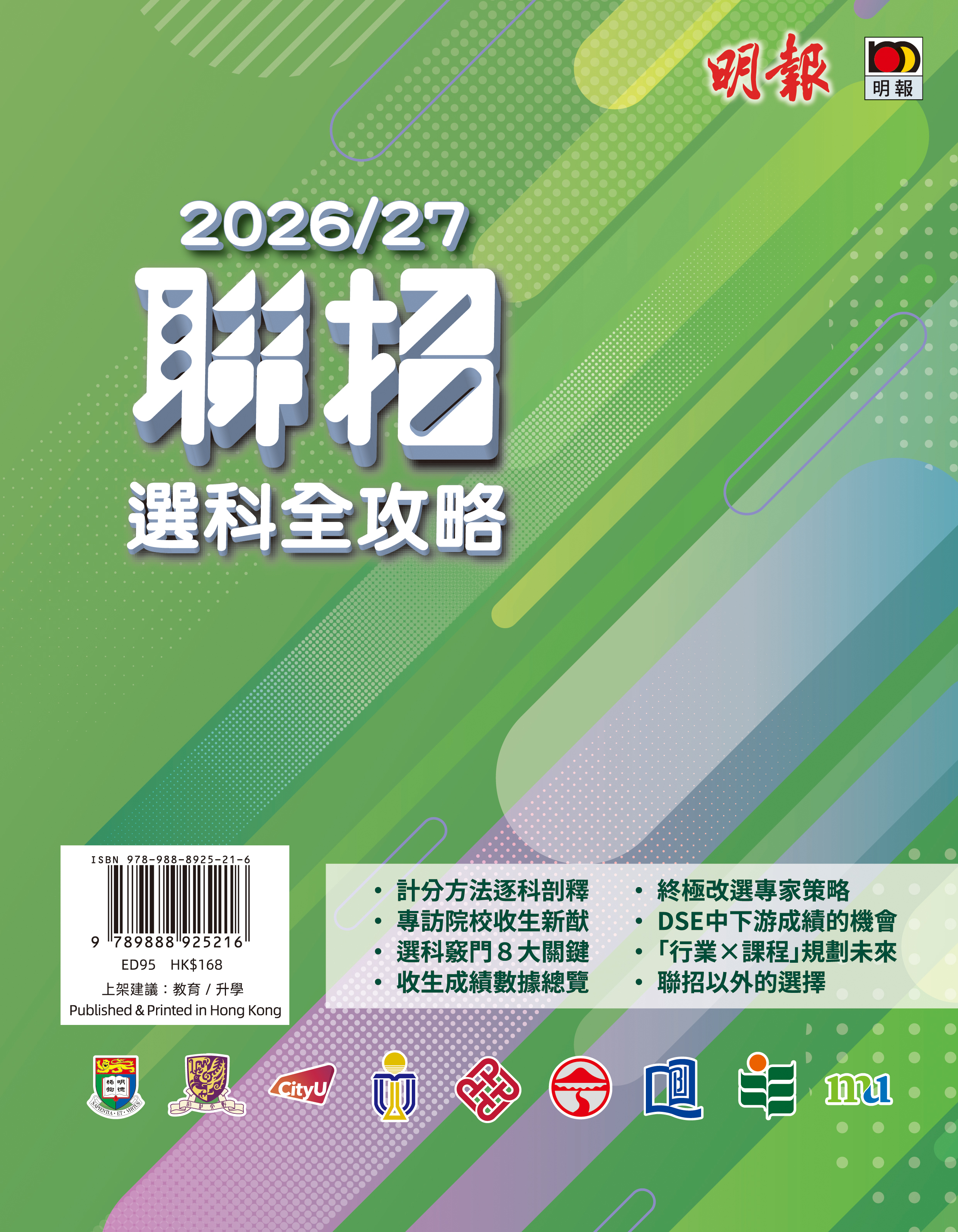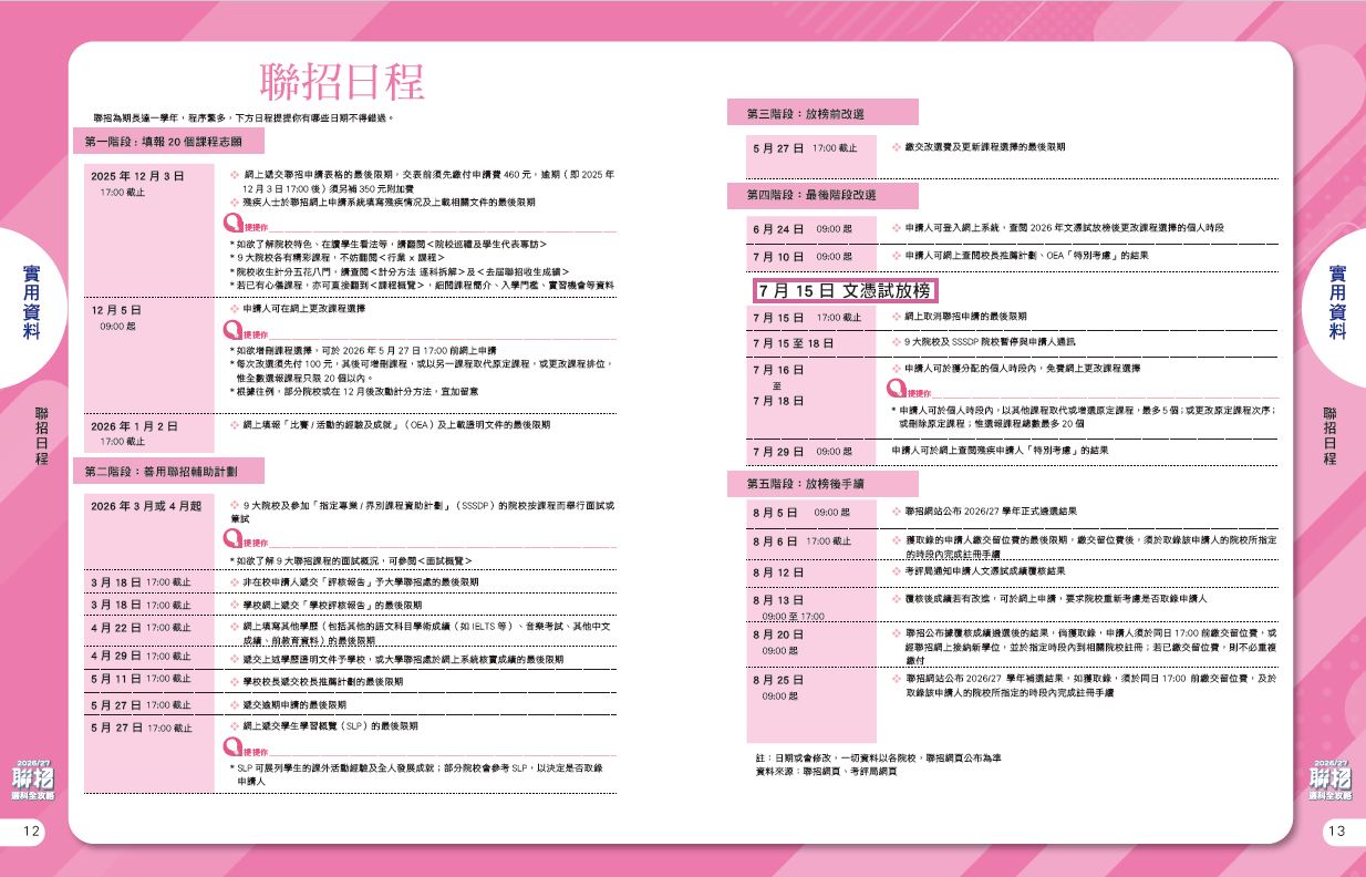 《明報》為幫助學生明智部署升學計劃,連續十多年出版《聯招選科全攻略》,蒐集最新及第一手準確的院校資料。全書劃分實用資料、選科錦囊、院校巡禮、收生成績、課程概覽、聯招以外六部分,囊括九大院校聯招課程及收生成績。同學一書在手,即可掌握實用而全面的聯招資訊,仔細策劃升學路向。